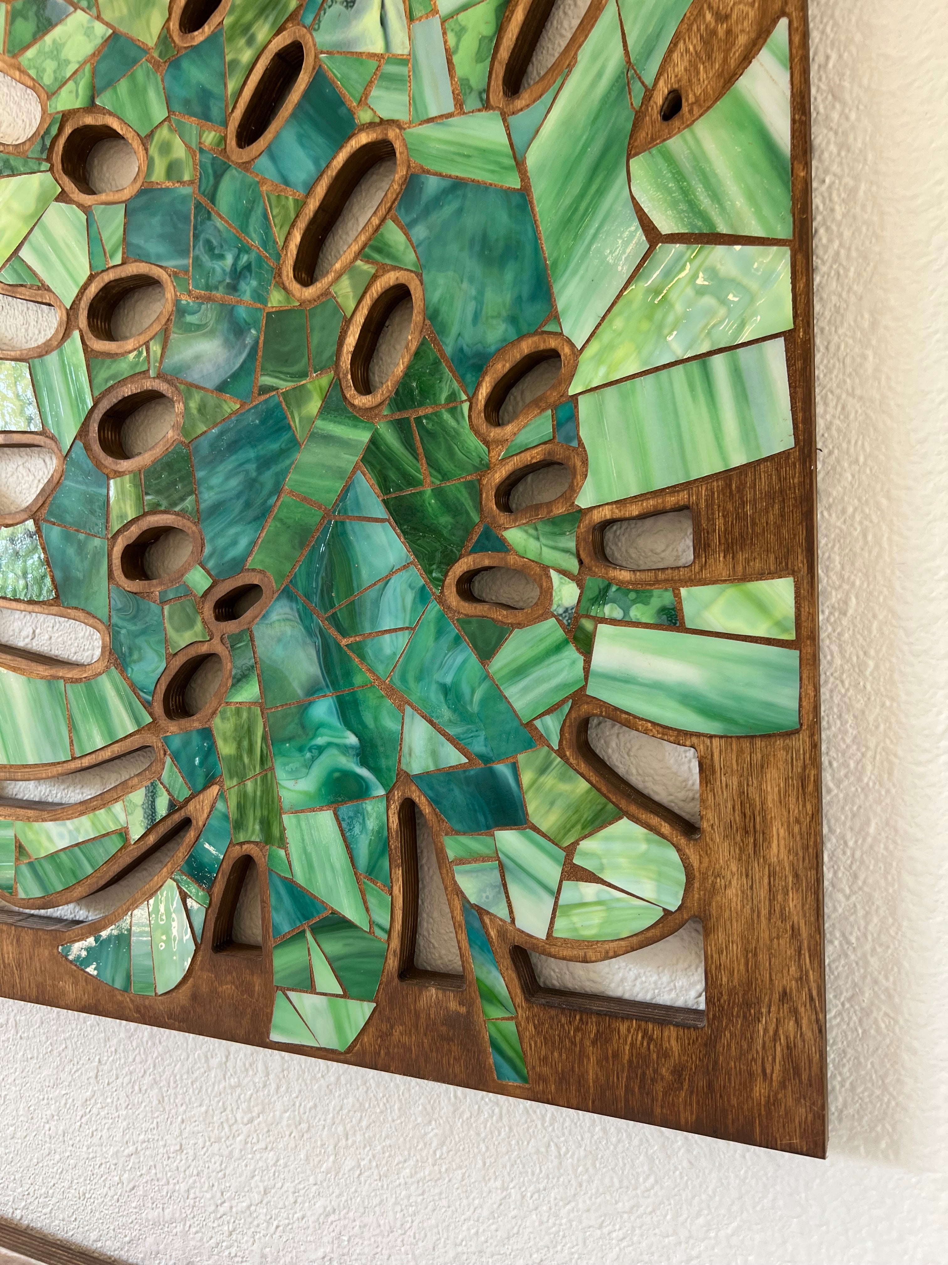 Hand-cut stained glass and mirror mosaic on 36” wood panel.